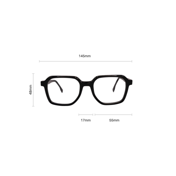 Kehysten leveys: 145mm Sangan pituus: 145mm Linssin leveys: 55mm Linssin korkeus: 48mm Nenäkaari: 17mm