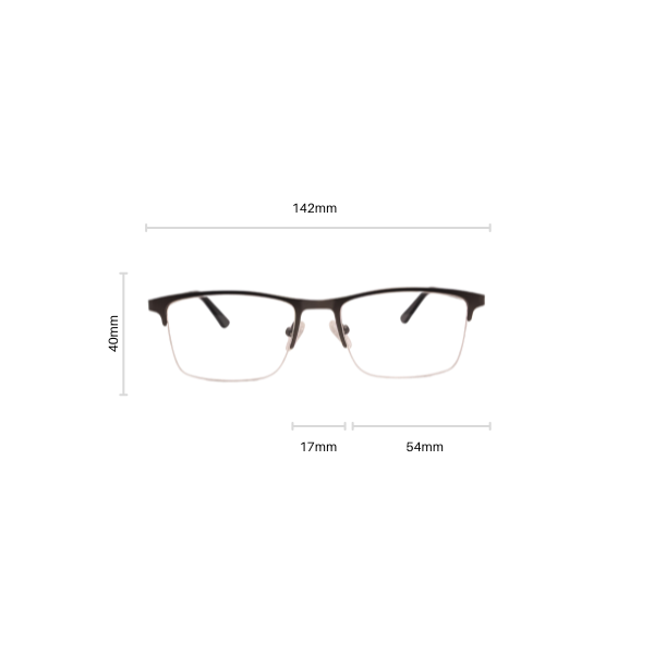 Kehysten leveys: 142mm Sangan pituus: 142mm Linssin leveys: 54mm Linssin korkeus: 40mm Nenäkaari: 17mm